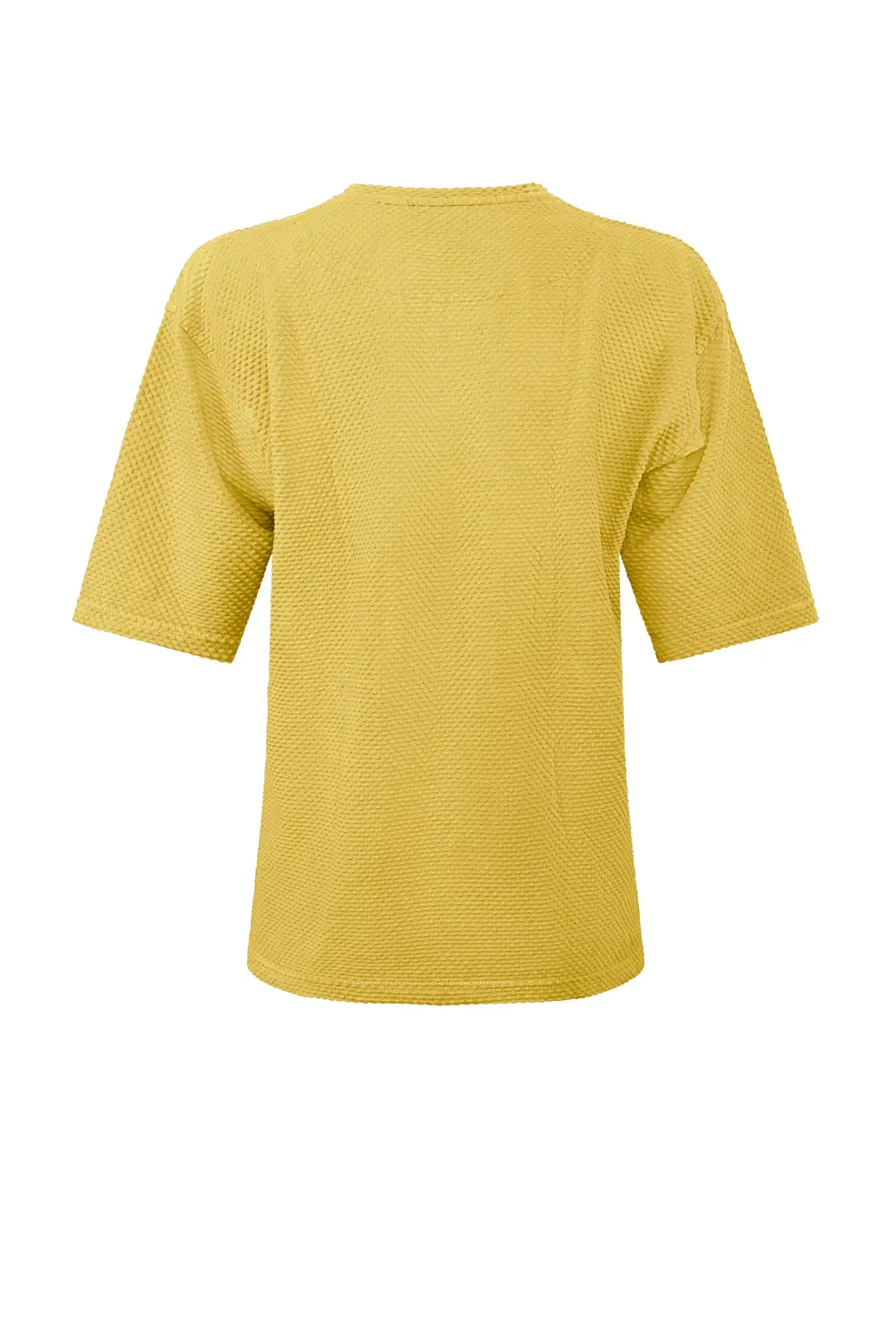 The T-shirt is crafted from fine yellow lycra cotton. It showcases the bubble texture neckline and making a quite sophistication with innovative bubble structure pattern. Pair with black or white pant from the collaboration for an elevated look.